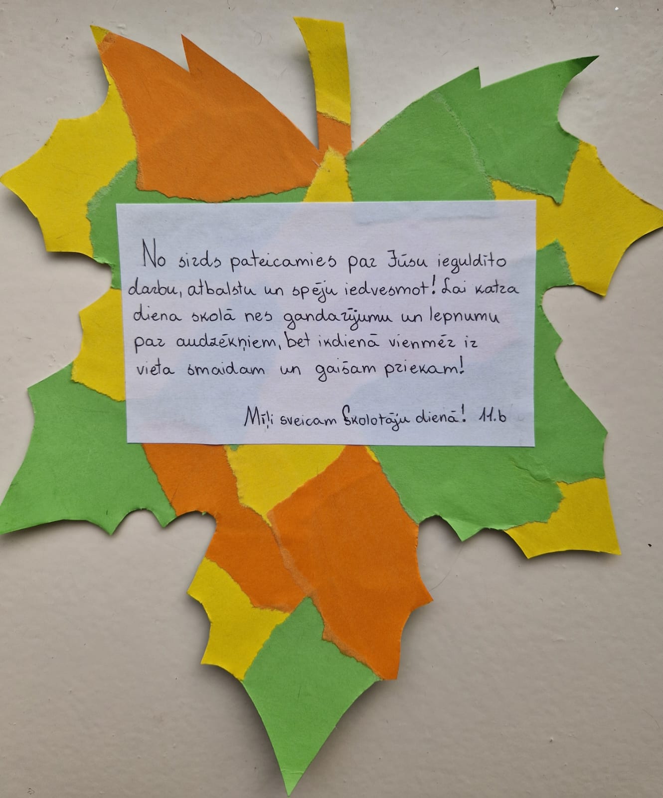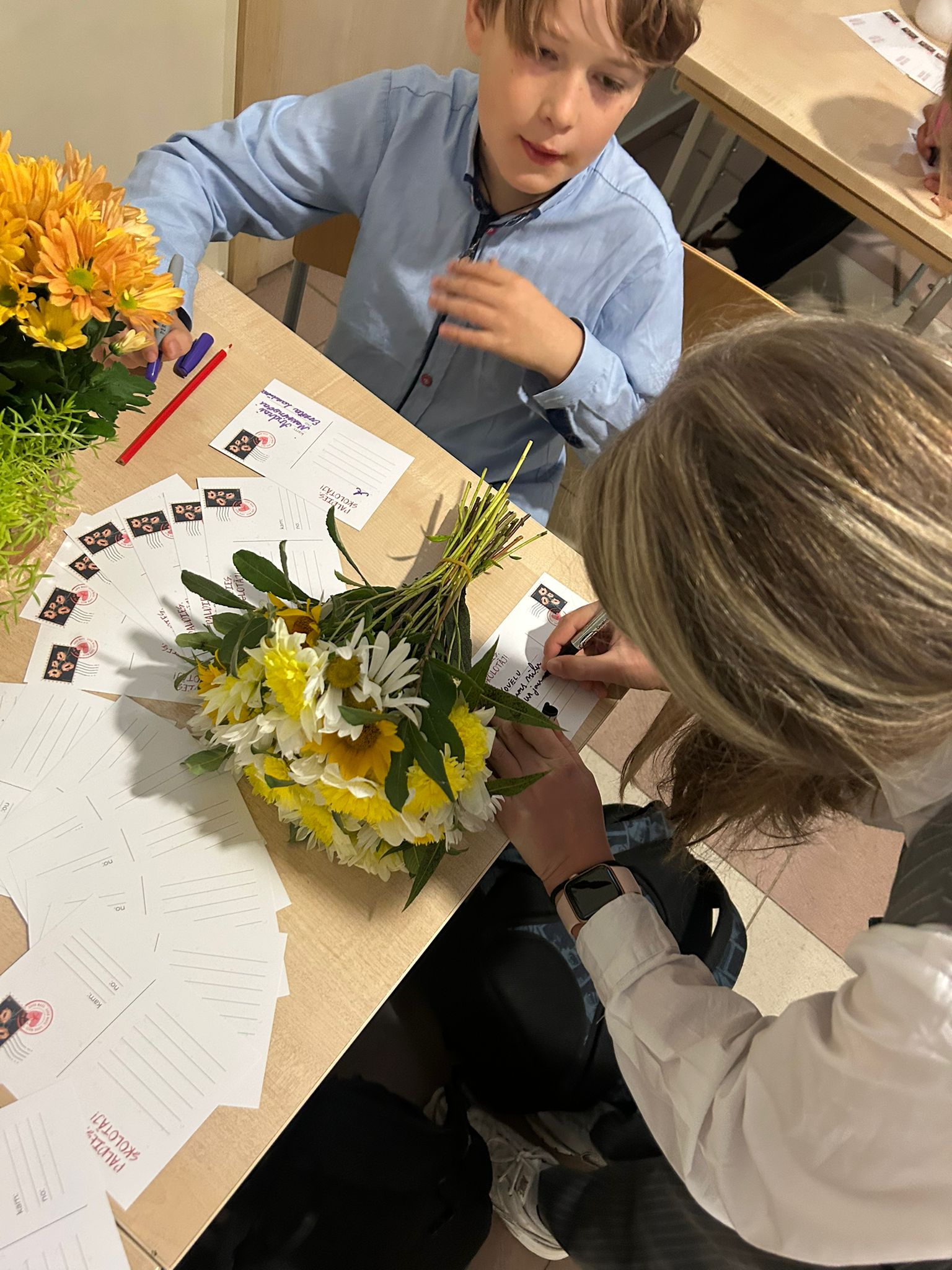 Jaunsargs Jānis Žagars klases kolektīva vārdā aicināja piespraust ikvienam pie sirds lentītes ukraiņu karoga krāsās. 10.a klase vairākas dienas gatavoja piespraudes un izdalīja tās pārējām klasēm. Atsaucīgie mazāko klašu skolēni palīdzēja izgatavot Miera dekoru – locīja zilus, dzeltenus un baltus papīra putnus. Te bija vajadzīga precizitāte un pirkstu veiklība.