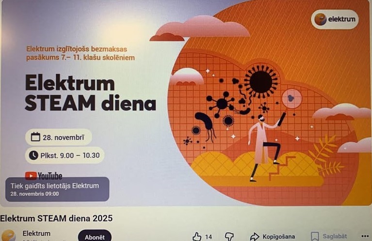 28. novembrī septiņas mūsu skolas 7.–11. klases piedalījās tiešsaistes seminārā “Elektrum STEAM diena” – pusotru stundu garā, aizraujošā ceļojumā zinātnes, tehnoloģiju un radošuma pasaulē. (STEAM – Science, Technology, Engineering, Arts, Mathematics – pieeja, kurā dabaszinātnes, tehnoloģijas, inženierzinātnes, māksla un matemātika savijas vienotā, radošā mācību procesā.)