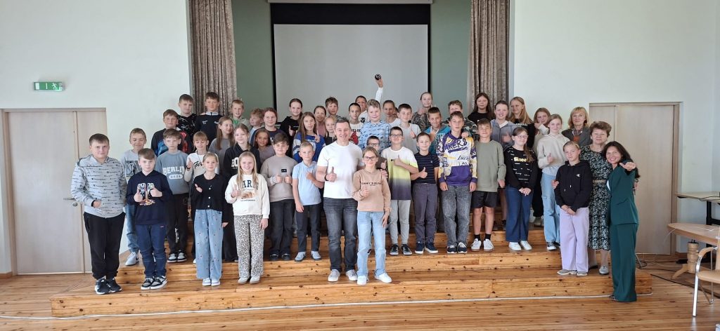 5.klašu skolēni uzņēma ciemos R.Laviņa hokeja skolas vadītāju Rodrigo Laviņu, kurš dalījās stāstos par savu hokeja karjeras sākumu, par sporta nozīmi veselībā un iespējām spēlēt hokeju Jēkabpilī.